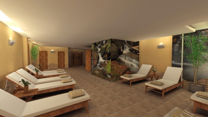Kamen je najbolj izrazit v prostoru, posebej ločenim z vgradnim bazenom, saj premišljeno načrtovana svetloba dodatno poudarja strukturo kamnite obloge. Za popestritev ambienta sta bili izbrani fototapeti z motivom potoka.